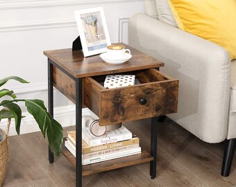 Amazon Com Vmree Industrial Nightstand 2 Tier End Side Table End Tables With Drawer Stable Metal Frame And Easy Assembly Bedroom Bedside Table Cabinet Wooden Look Accent Furniture For Living Room Kitchen Dining